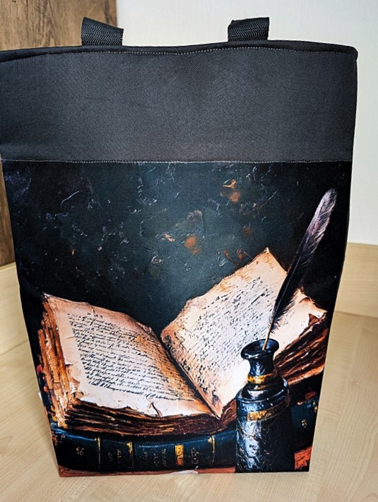 Taška s Knihou je v kombinaci s tmavě šedou látkou je pevná a téměř nepromokavá. Je vhodná pro denní nošení i třeba na výlet.