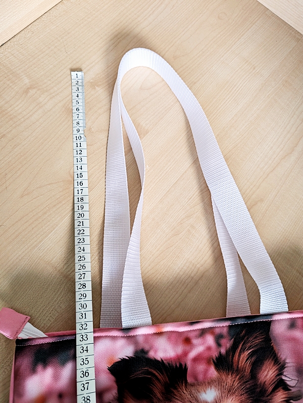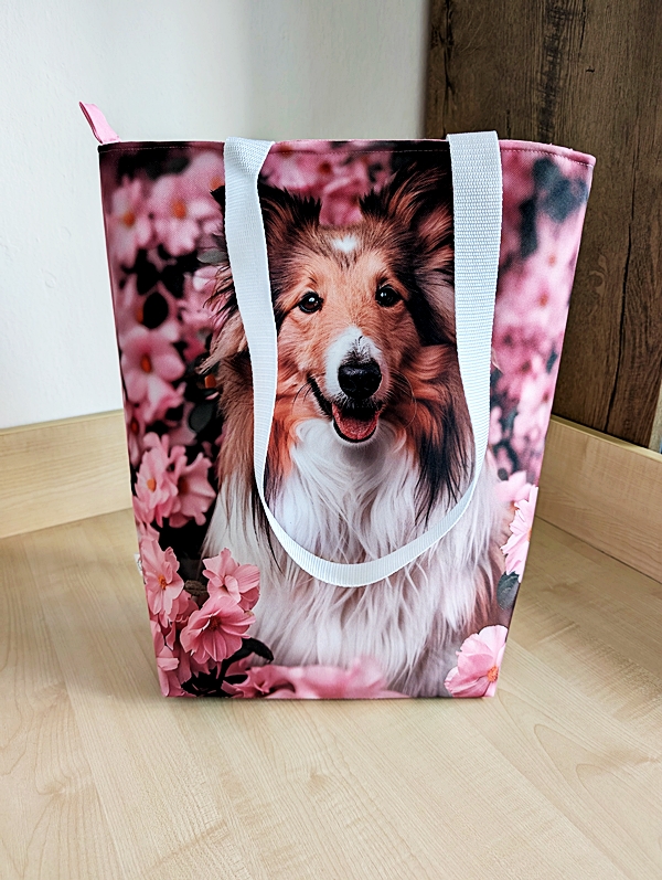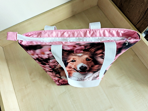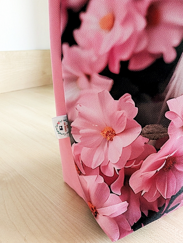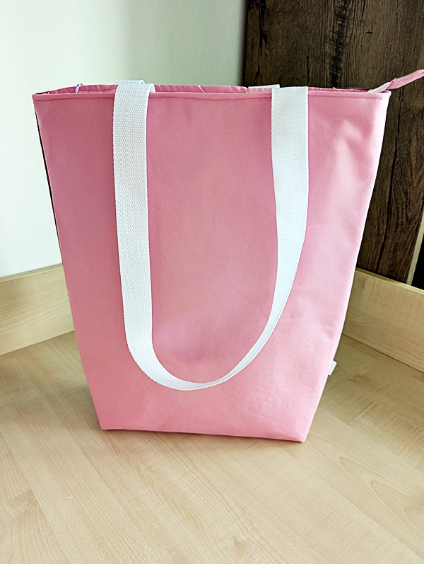 Taška je ušitá v kombinaci s růžovou látkou. Je vhodná pro denní nošení i třeba na výlet.