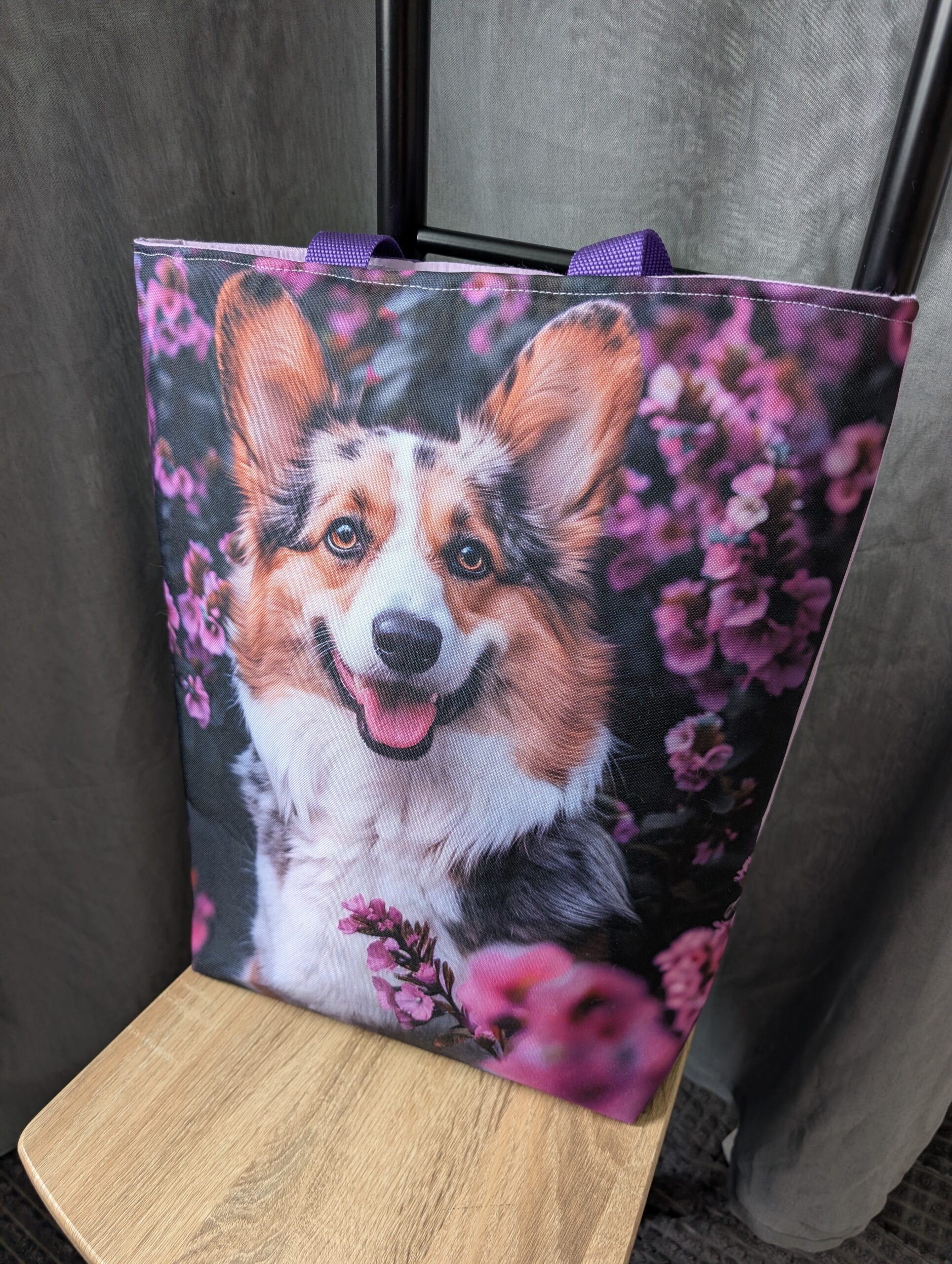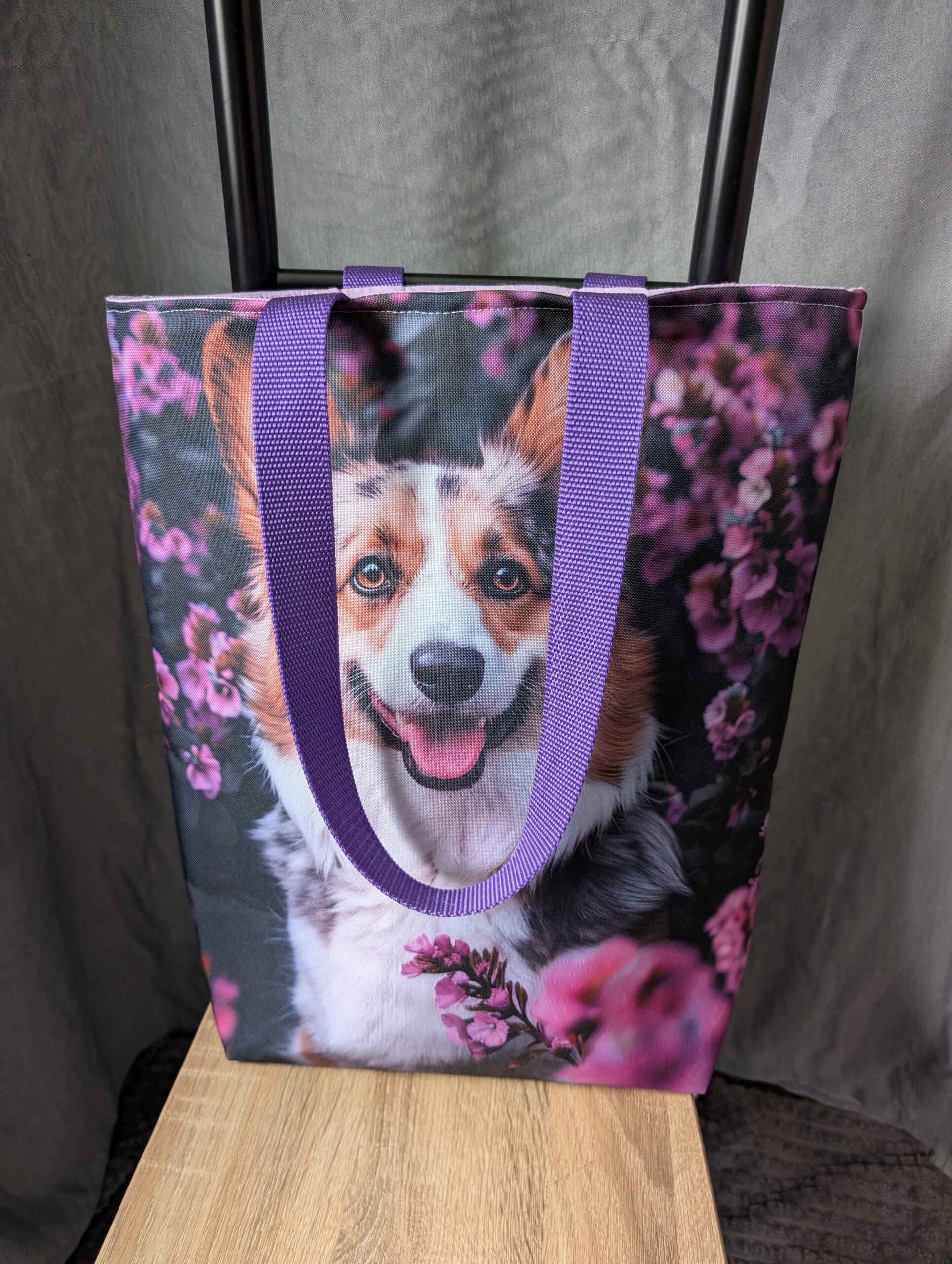 Taška s pejskem v kombinaci s fialovou látkou (odstín lila) je pevná a téměř nepromokavá. Je vhodná pro denní nošení i třeba na výlet.
